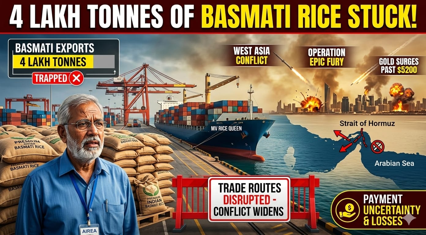 India’s basmati rice trade is facing a serious disruption as the conflict in West Asia continues to grow. According to the All India Rice Exporters’ Association (AIREA), nearly 4 lakh metric tonnes (mt) of basmati rice is either stuck at Indian ports or currently in transit, with no clear timeline for when normal trade can resume.