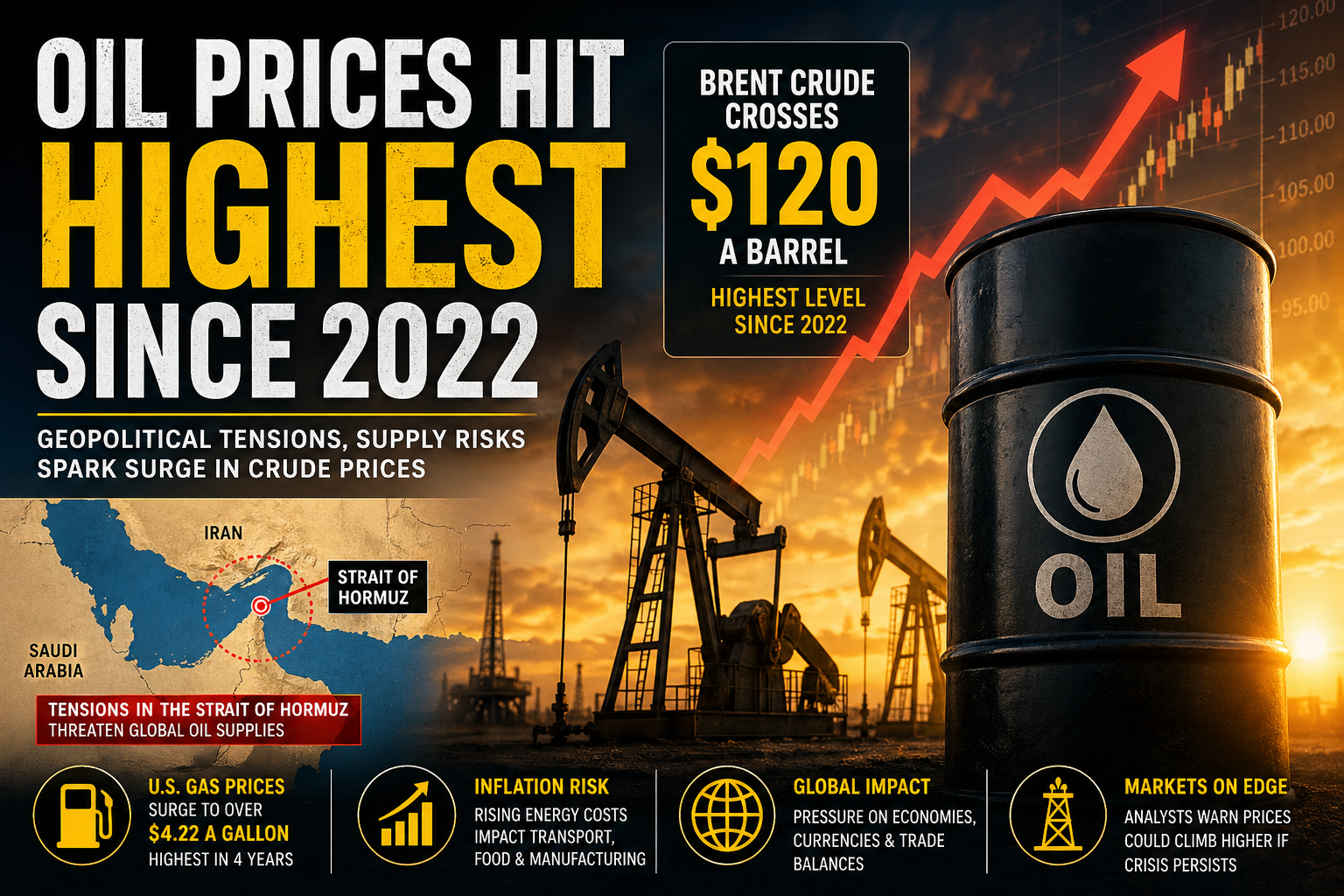 Global oil markets have entered a phase of extreme volatility, with crude prices surging to their highest levels since 2022. Brent crude, the international benchmark, has crossed the $120 per barrel mark, with some sessions even pushing toward $126—levels not seen in nearly four years. This sharp rally reflects a convergence of geopolitical tensions, supply disruptions, and heightened uncertainty in global energy markets.