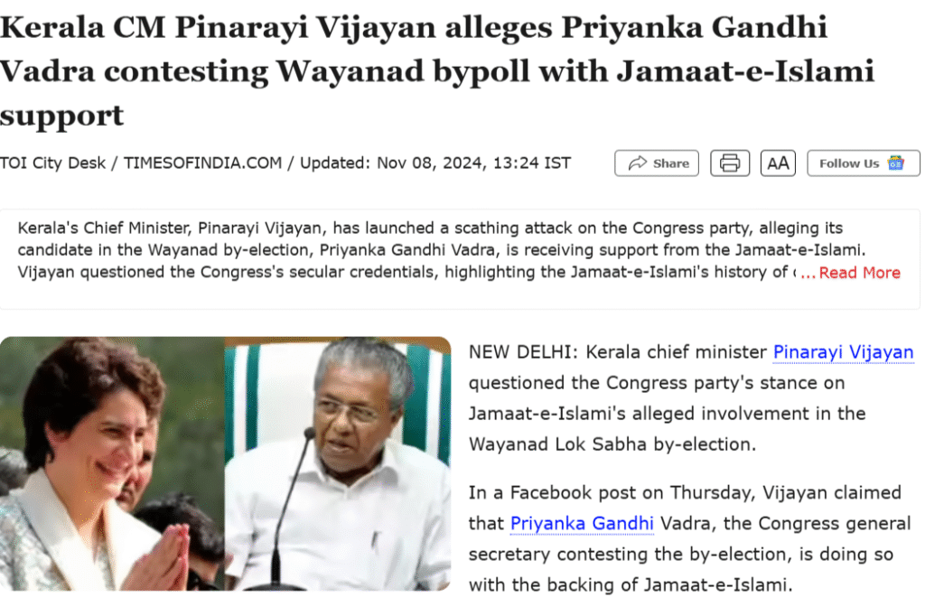 Significantly, even Kerala Chief Minister Pinrayi Vijayan had questioned the closeness of Jamaat-e-Islami with Congress during the recent Wayanad Lok Sabha by-elections, where Priyanka Gandhi stood as the Congress candidate. He argued how can Congress, who claims to be a secular party, take backing from an organisation, which opposes elections and believes in sectarianism.