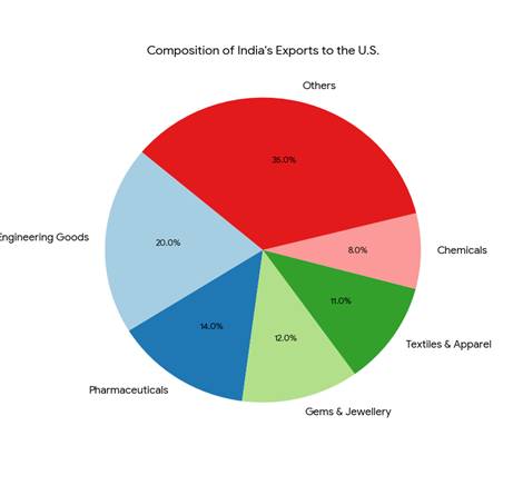 India’s export basket to the United States reflects both diversification and upgrading. Pharmaceuticals constitute a critical pillar, with India supplying a significant share of generic medicines consumed in the US healthcare system. Engineering goods and machinery exports reflect deeper integration into manufacturing value chains. Gems and jewellery remain labour-intensive export segments sensitive to US consumer demand cycles.