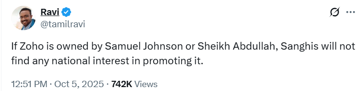A Dravidian X (Twitter) user named Ravi wrote: “If Zoho were owned by Samuel Johnson or Sheikh Abdullah, the Sanghis wouldn’t have promoted it in the name of national interest.”